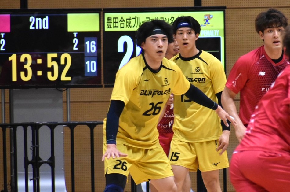 現在トップを走る豊田合成ブルーファルコン名古屋は、レギュラーシーズンで幾度も激闘を繰り広げてきたジークスター東京と対戦。試合は一進一退の攻防が続いていたが、長らく戦線を離れていたベテランの域に入ってきたブルーファルコンの山口勇樹や原田大夢、今年2年目の若手・荒瀬廉らの活躍により16−13で前半を折り返す。後半開始29秒で原田のスピード得点を皮切りにブルーファルコンが試合の主導権を握り、リーグH屈指の若手イケメン・石嶺秀や山口の活躍で試合は35−31でブルーファルコンが勝利。6勝無敗でトップのまま今大会を終えた。